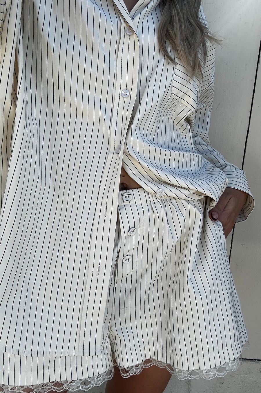 A romantic take on an everyday staple. The Noemi Lace Shorts are crafted from a lightweight woven cotton blend with soft blue and white pinstripes. Designed with a relaxed fit and delicate lace trim, they bring an effortless femininity to lazy mornings and sun-drenched afternoons. Pair them with the matching Noemi Button Up for the full set.